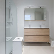 Moderne badkamer met inloopdouche en dubbele lavabo.